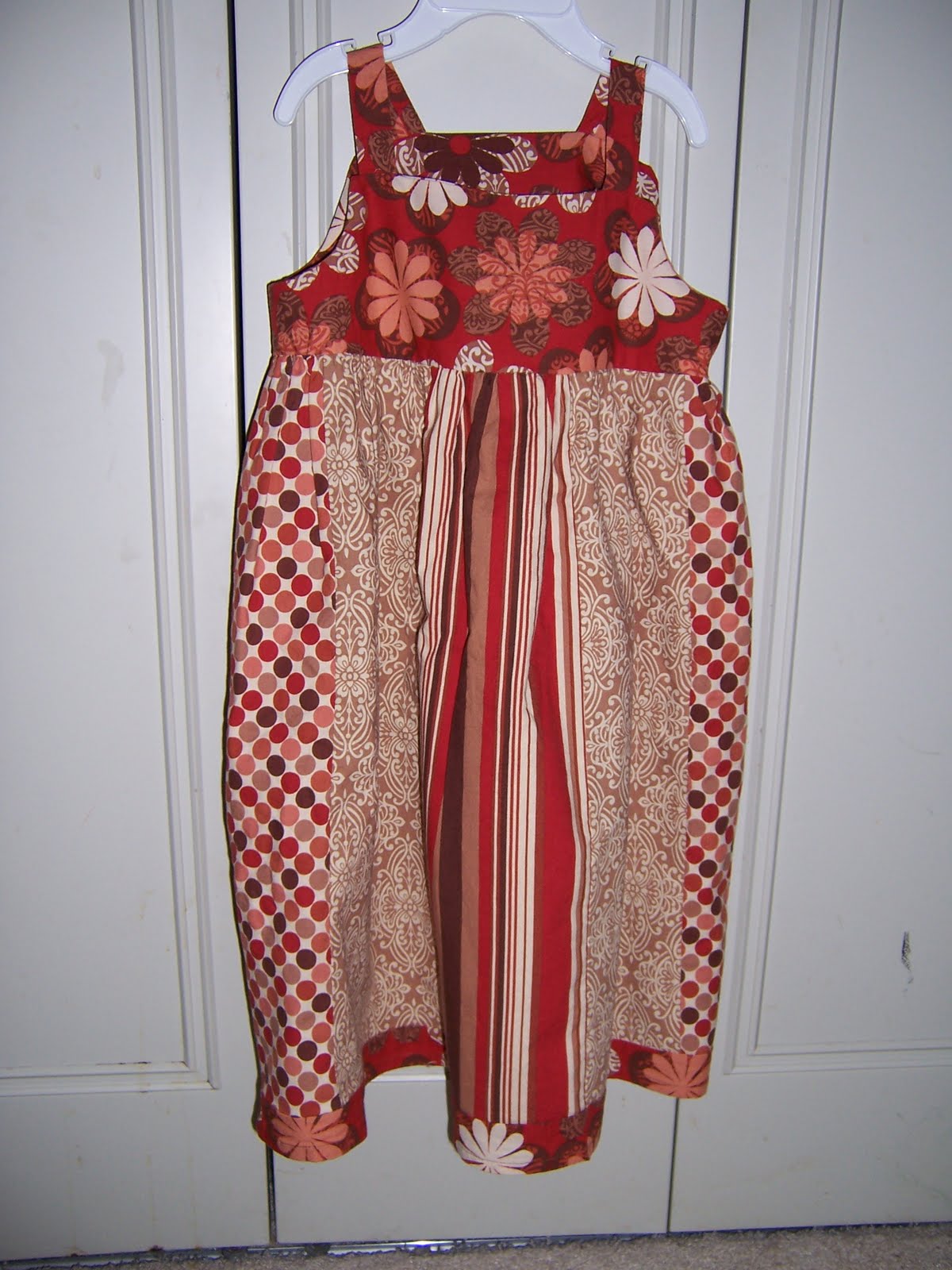 Then, I decided to use the gathers in the pattern but change it to a vertical paneled top/dress instead of a top/dress that had horizontal panels. Check it out!! I love choosing the coordinating fabrics in the dress top and panel. Fabric stores make choosing the fabric really easy because there are often multiple bolts of fabric in a design line so all you have to do is choose the ones you like in that line. By the way, Isabelle accessorized herself in the brown and red dress. What looks better with that dress than a blue bow and orange necklace?